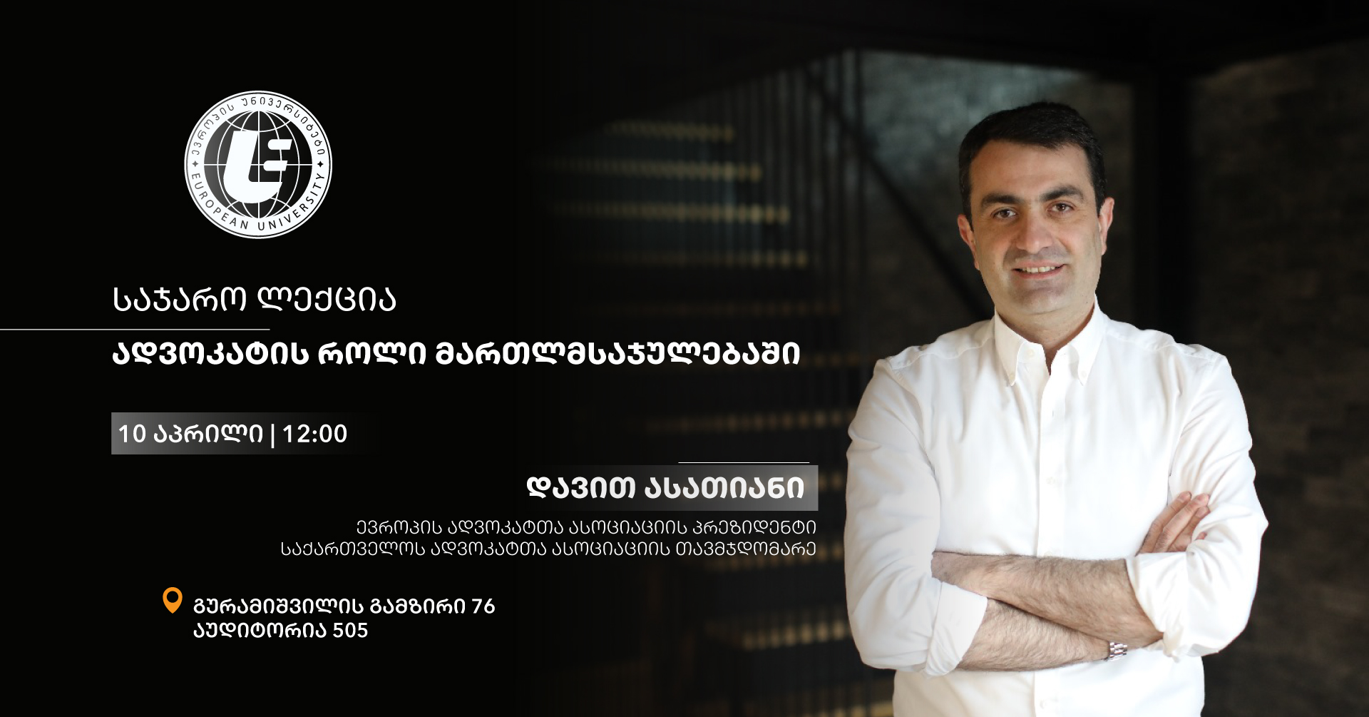ლექციას საქართველოს ადვოკატთა ასოციაციის თავმჯდომარე და ევროპის ადვოკატთა ასოციაციის (AEA-EAL) პრეზიდენტი დავით ასათიანი გაუძღვება.