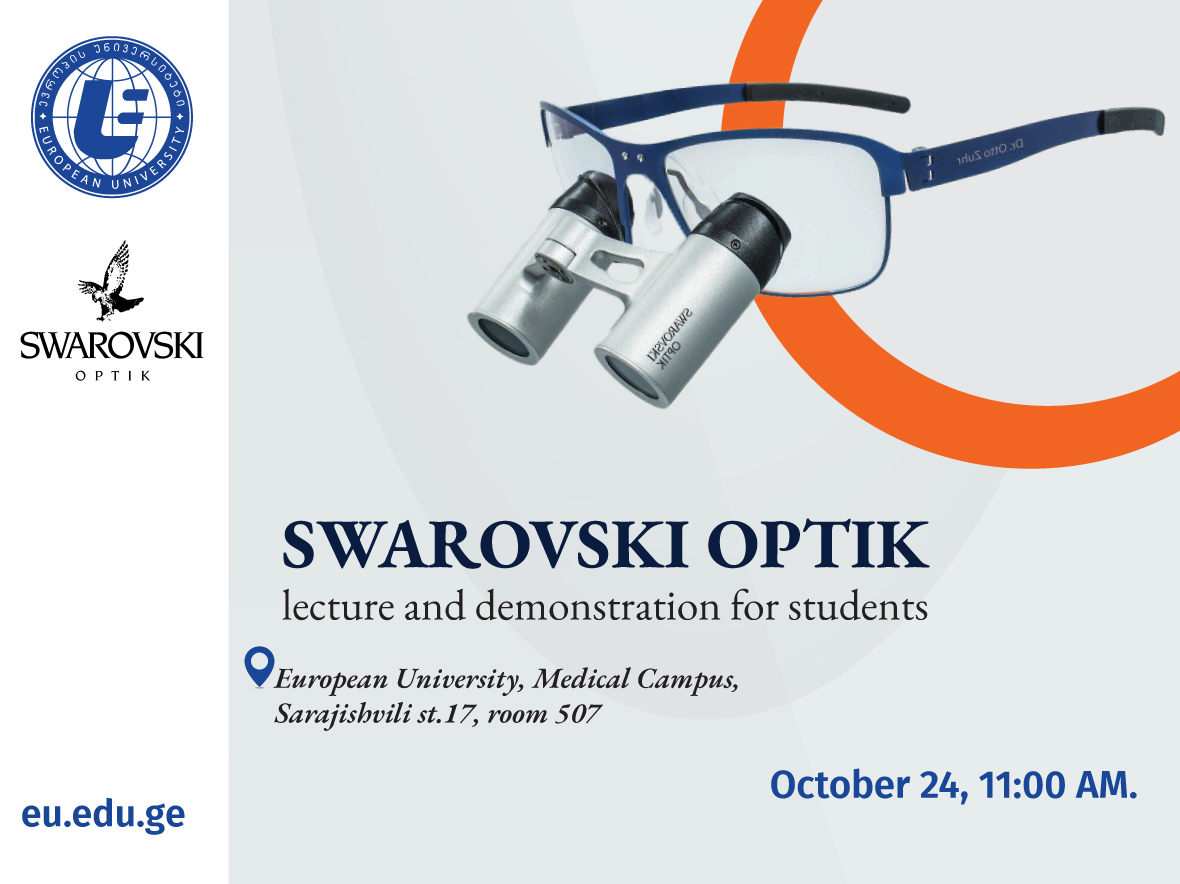 24 ოქტომბერს, 11:00 საათზე, „ევროპის უნივერსიტეტის“ სტუდენტებისთვის სტომატოლოგიაში უზუსტესი მაღალი სიშორის ოპტიკური მოწყობილობების მწარმოებელი კომპანია SWAROVSKI OPTIK საჩვენებელ ლექციას და პრეზენტაციას გამართავს.