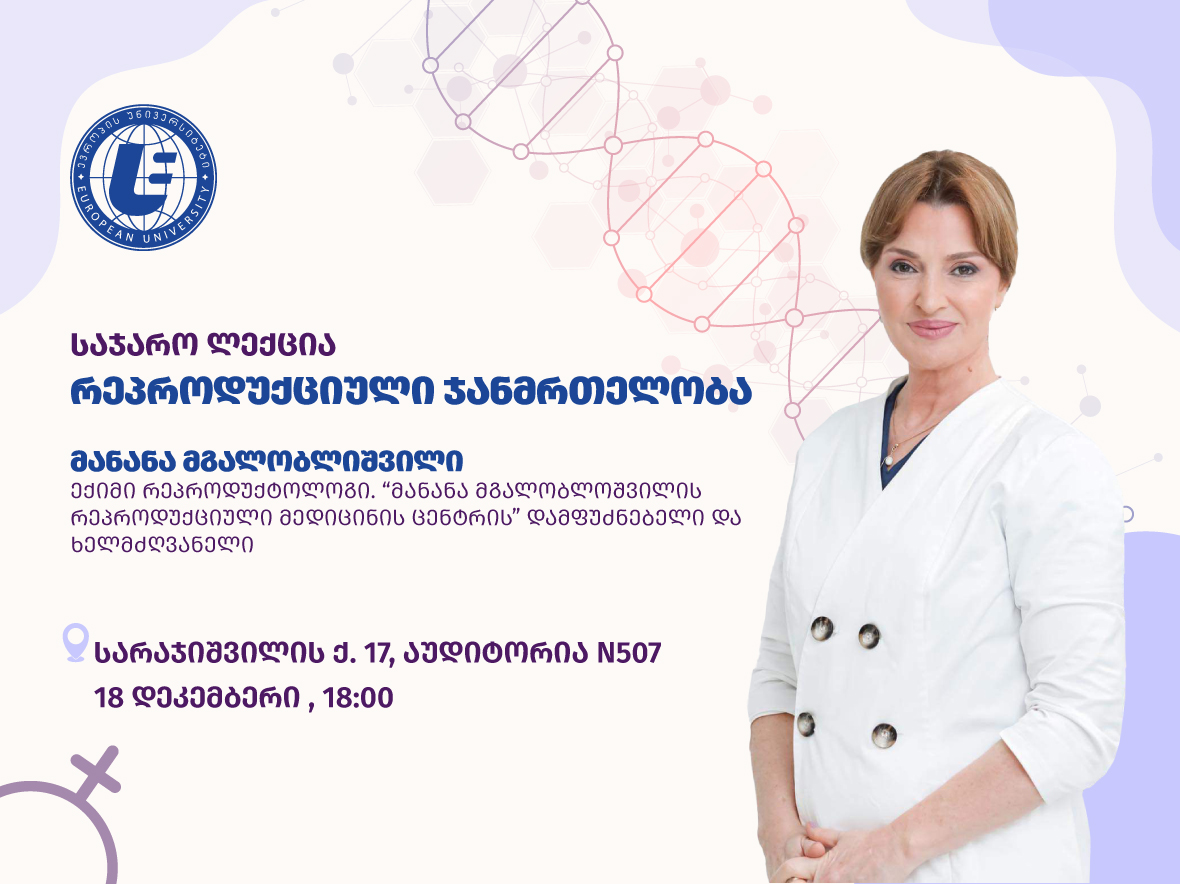 18 დეკემბერს, 18:00 საათზე, ექიმი რეპროდუქტოლოგი მანანა მგალობლიშვილი “ევროპის უნივერსიტეტის” სტუდენტებისთვის საჯარო ლექციას გამართავს.