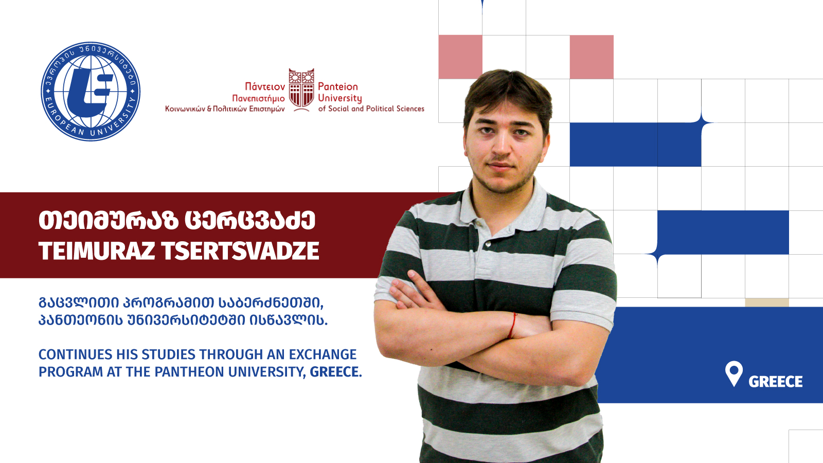 დამატებითი კონკურსის შედეგების მიხედვით, თეიმურაზ ცერცვაძე, საერთაშორისო ურთიერთობების საბაკალავრო პროგრამის სტუდენტი 2024/2025 სასწავლო წლის შემოდგომის სემესტრს მობილობით პანთეიონის უნივერსიტეტში (საბერძნეთი) გაატარებს.