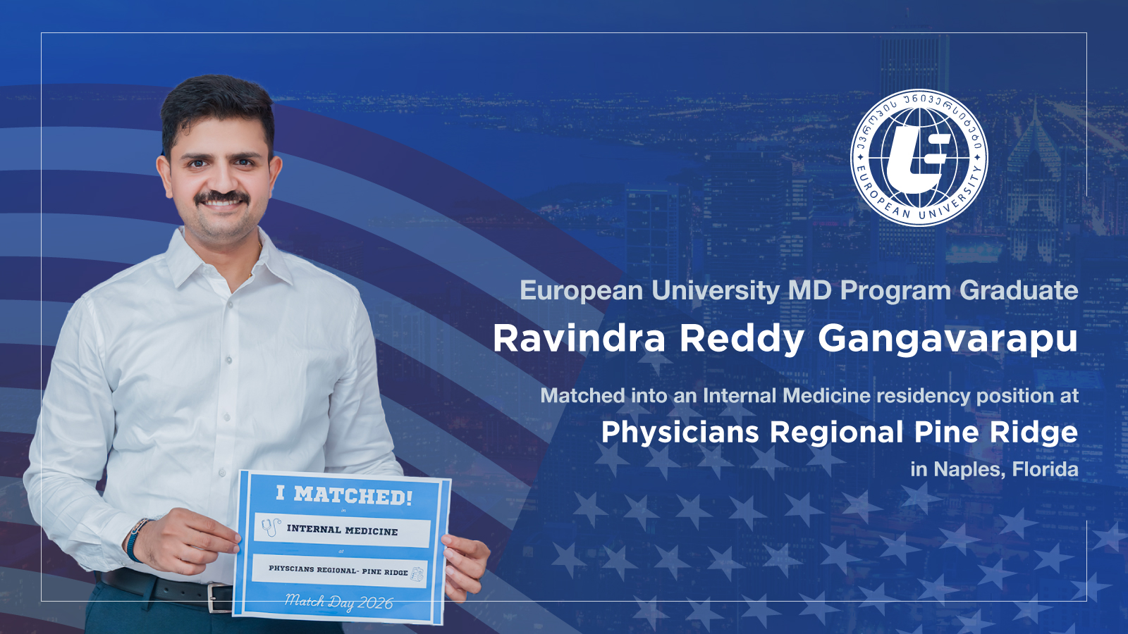Ravindra Reddy Gangavarapu, a graduate of the European University’s Medical Doctor program, has been matched to an Internal Medicine residency program in the United States.