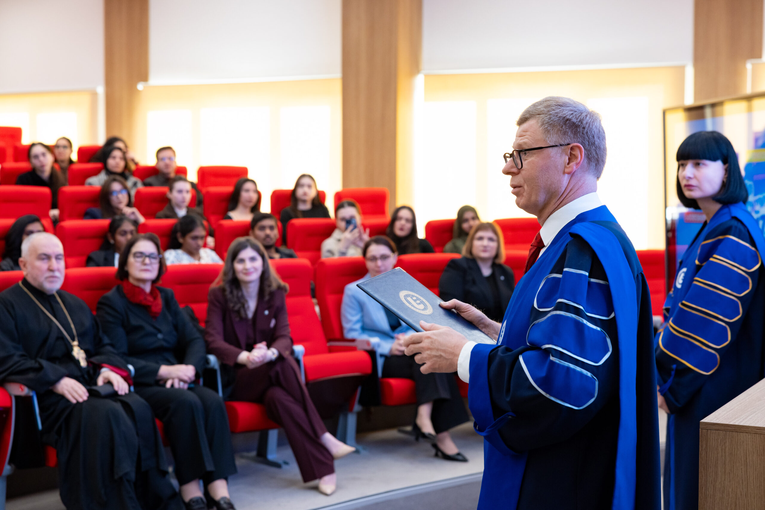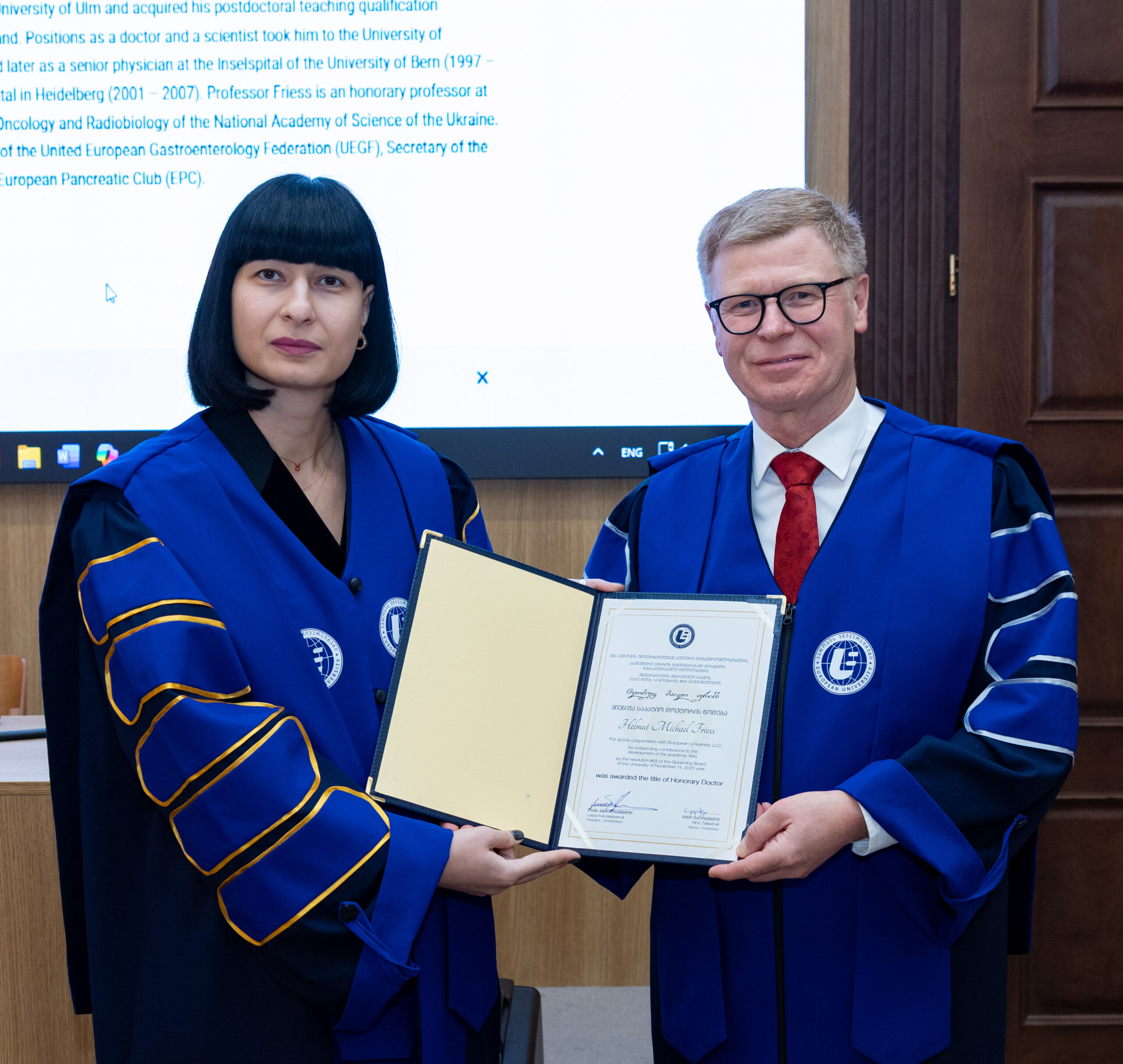 Professor Friess was presented with the Honorary Doctor’s diploma by the Rector of “Europe University,” Nino Taliashvili.