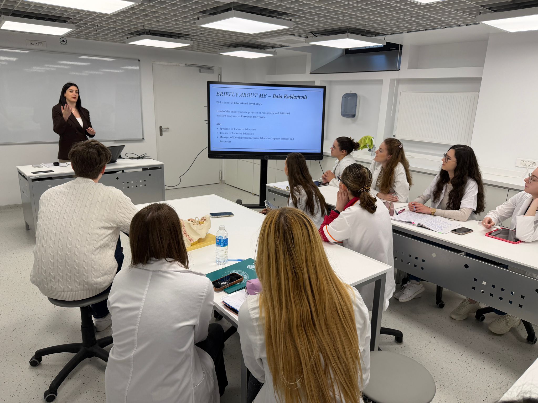 On the first day, Professor Kublashvili delivered a lecture to around 60 students, presenting an overview of Georgia, the academic programs of European University, and the country’s experience in inclusive education.