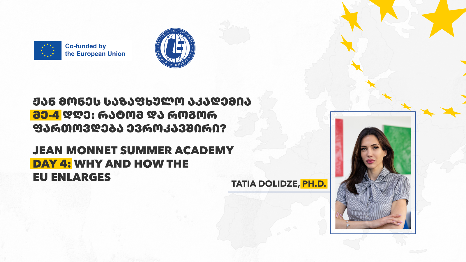 Day 4 of the Jean Monnet Summer Academy, “EU Enlargement: Theory, Practice, and Contemporary Challenges,” was delivered entirely by Tatia Dolidze, Ph.D. (Jean Monnet module coordinator; Associate Professor and Head of the International Relations programme, European University, Georgia).