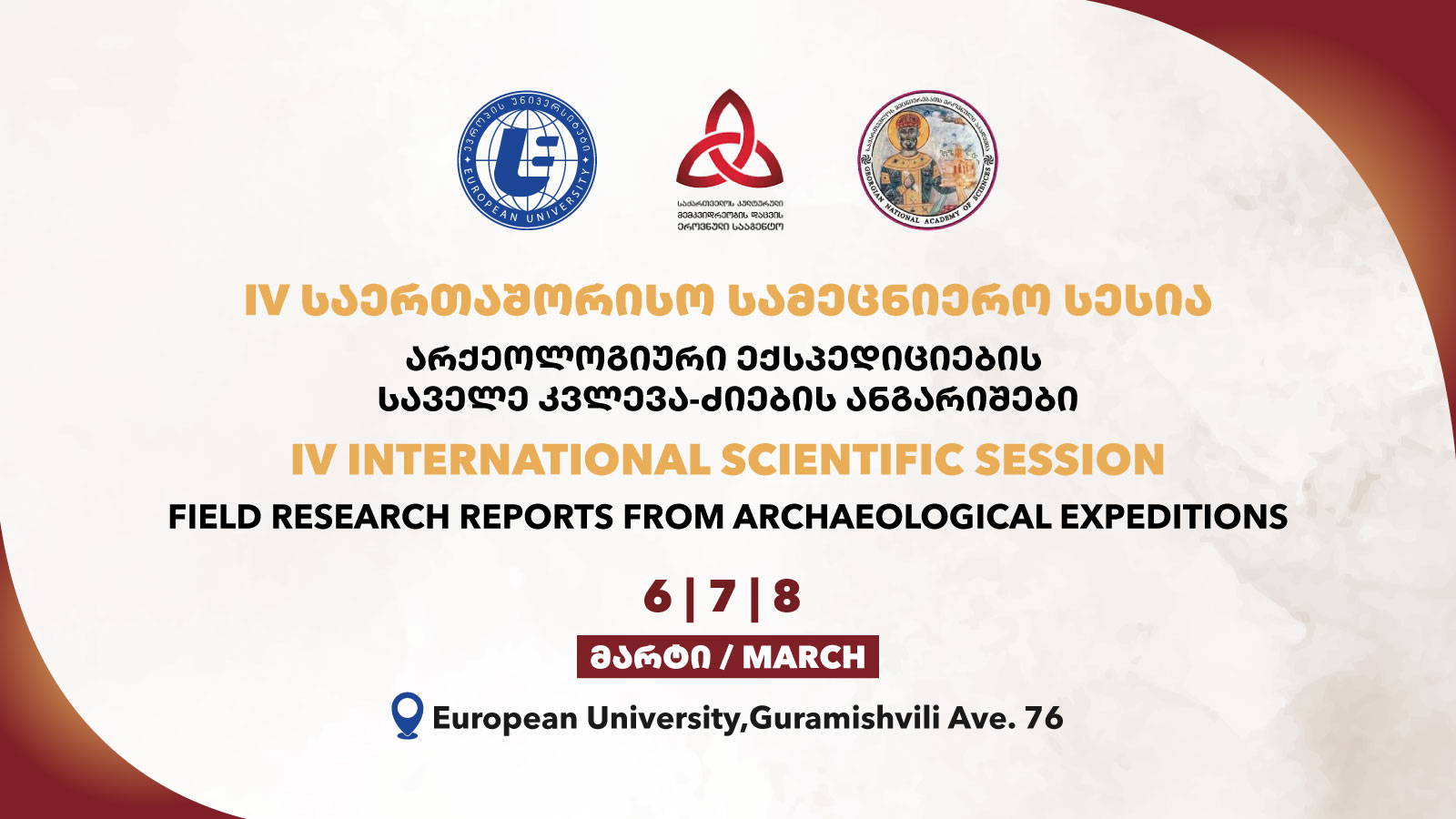 On March 6, 7, 8, 2026, the IV International Scientific Session organized by the Georgian National Academy of Sciences, the National Agency for Cultural Heritage Preservation of Georgia, and the European University’s Academician Andria Apakidze Institute of Archaeology will be held at European University.