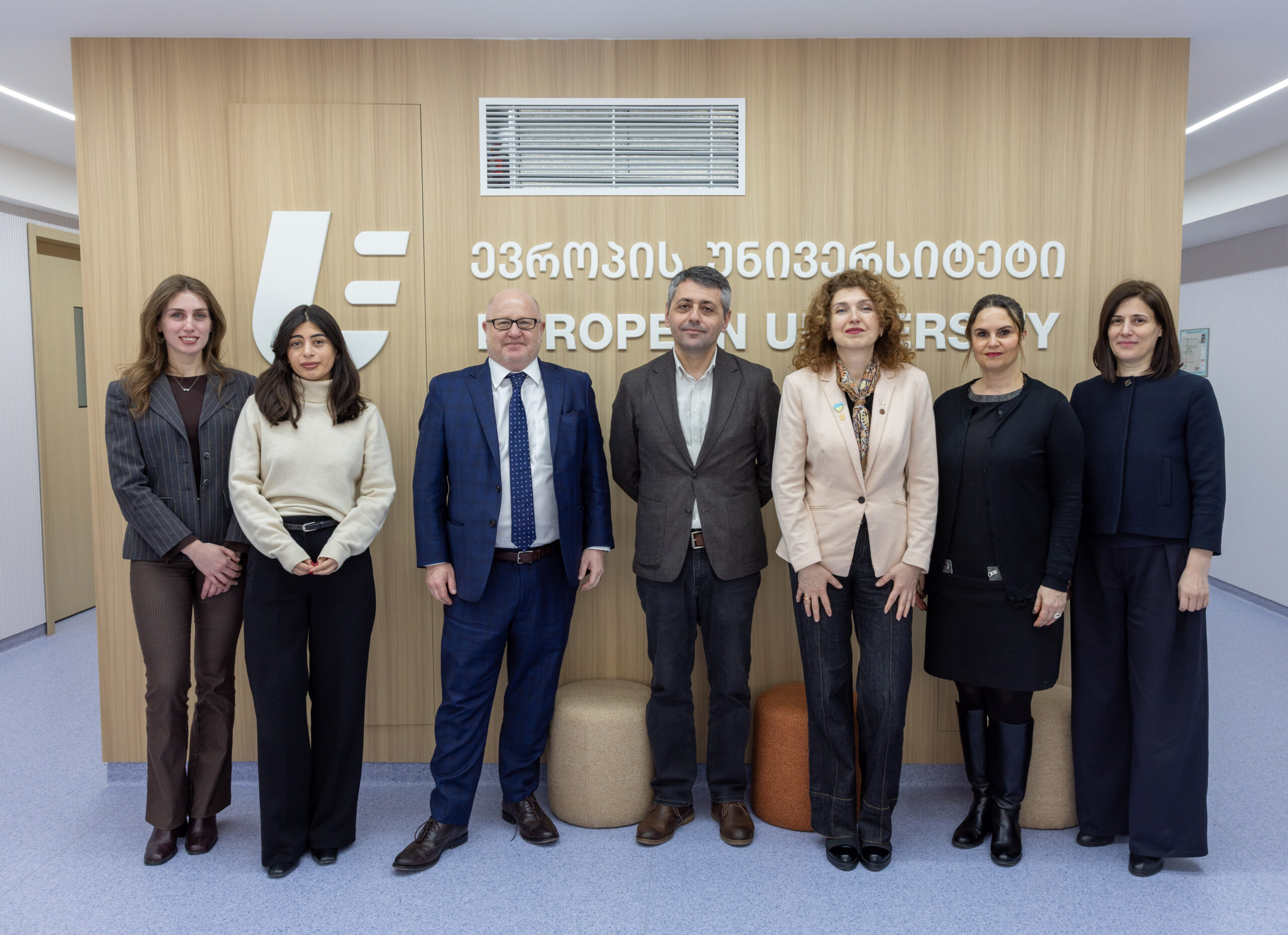 The delegation was welcomed on behalf of the European University by Vice-Rector for International Relations Nikoloz Parjnadze, Vice-Rector for Quality Assurance Sopio Khundadze, Head of the International Relations Office Mariam Orjonikidze, and Head of the Public Relations and Marketing Department Laura Papaskua.