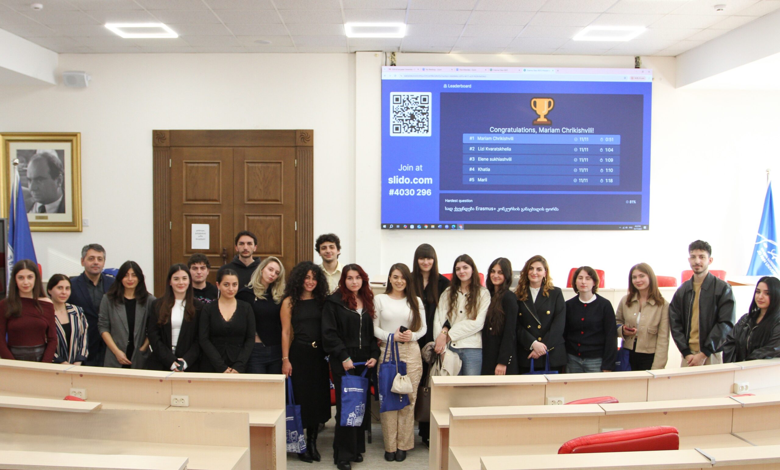 დასასრულს ჩატარდა სახალისო ქვიზი, რომლის გამარჯვებულებიც ევროპის უნივერსიტეტის სახელით სიმბოლური პრიზებით დაჯილდოვდნენ.