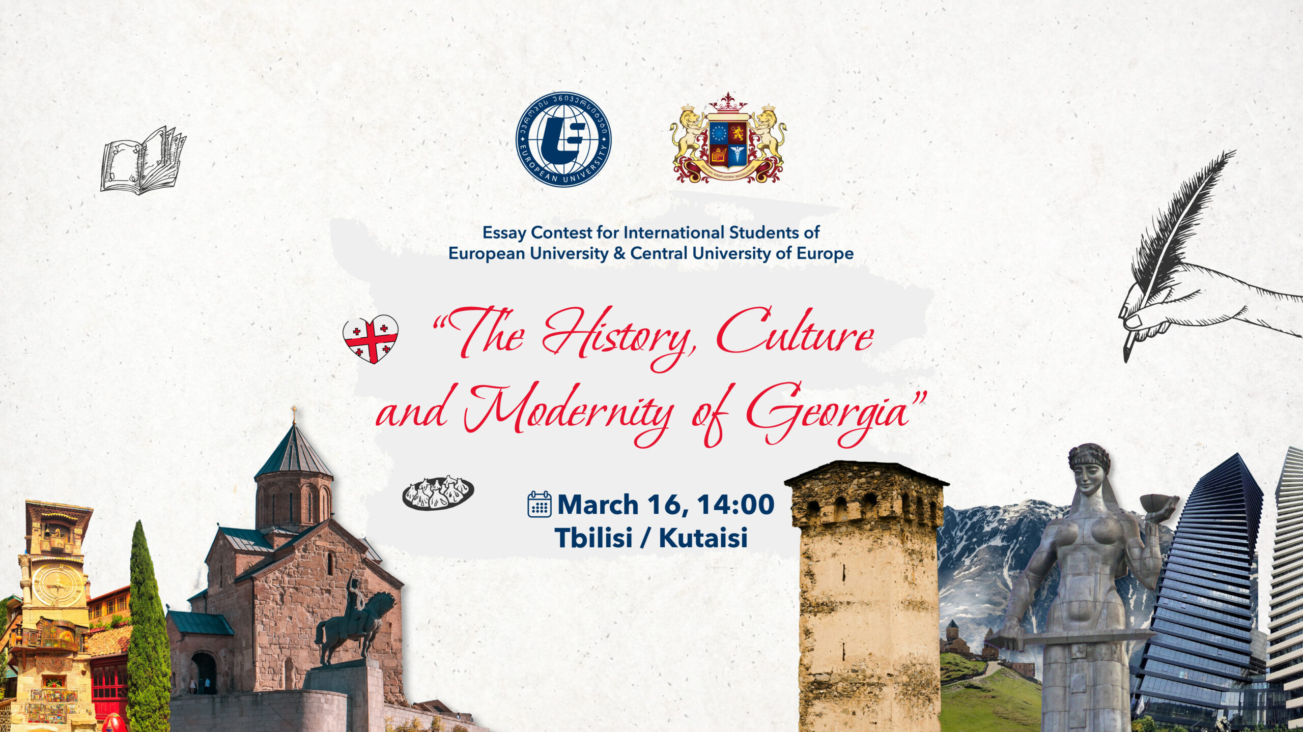 „ევროპის უნივერსიტეტის“ სტუდენტთა და კურსდამთავრებულთა მომსახურების ცენტრის ორგანიზებით, საერთაშორისო სტუდენტებისთვის, ესეების კონკურსი თემაზე – „საქართველოს ისტორია, კულტურა და თანამედროვეობა“ გაიმართება.