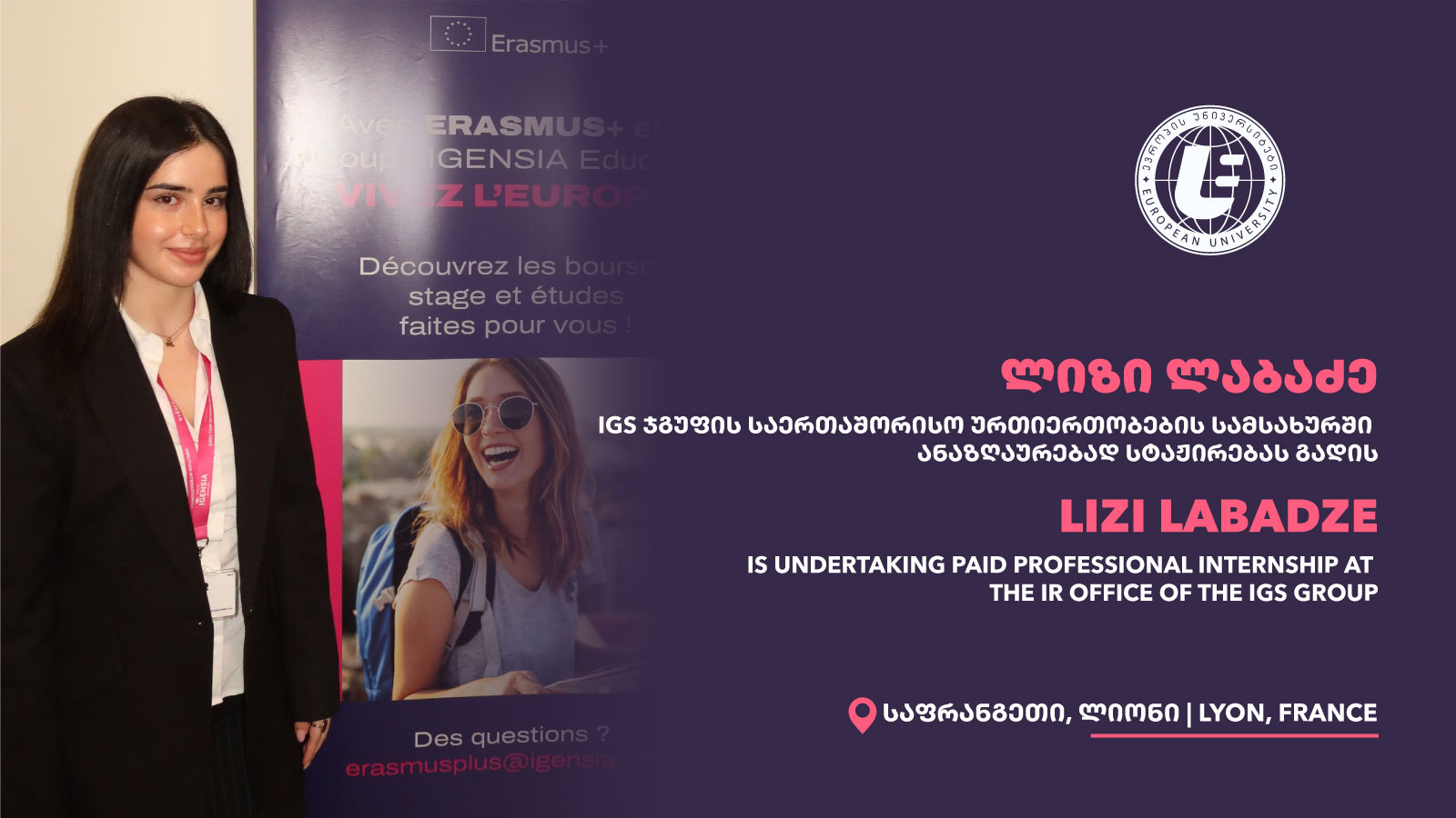 “ევროპის უნივერსიტეტის” საერთაშორისო ურთიერთობების საბაკალავრო პროგრამის სტუდენტი ლიზი ლაბაძე საფრანგეთში, ლიონის IGS ჯგუფის საერთაშორისო ურთიერთობების სამსახურში, ორთვიან ინტენსიურ და ანაზღაურებად პროფესიულ პრაქტიკას გადის.