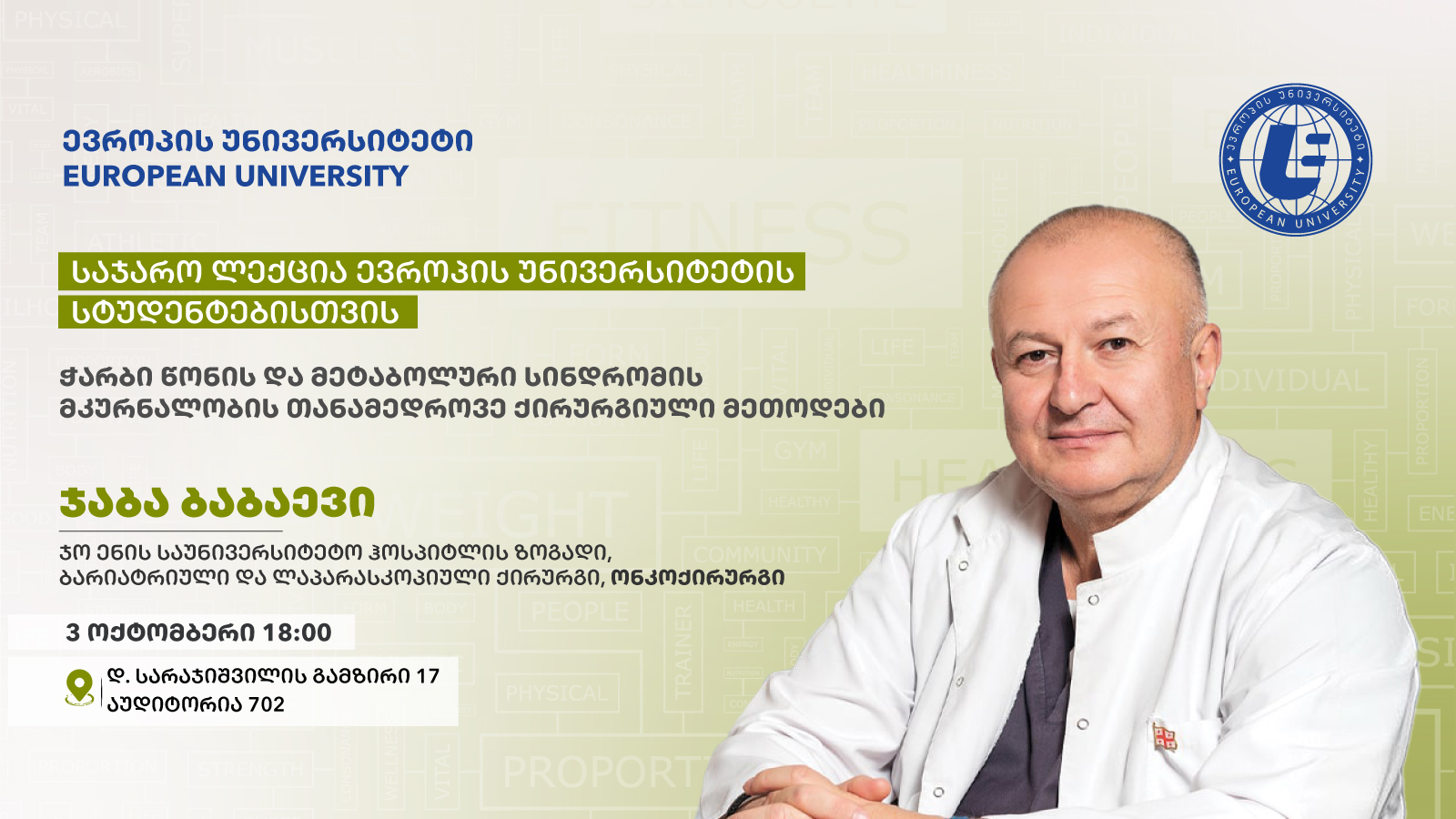 3 ოქტომბერს, 18:00 საათზე, „ევროპის უნივერსიტეტში“ საჯარო ლექცია თემაზე – „ჭარბი წონისა და მეტაბოლური სინდრომის მკურნალობის თანამედროვე ქირურგიული მეთოდები“ გაიმართება.
