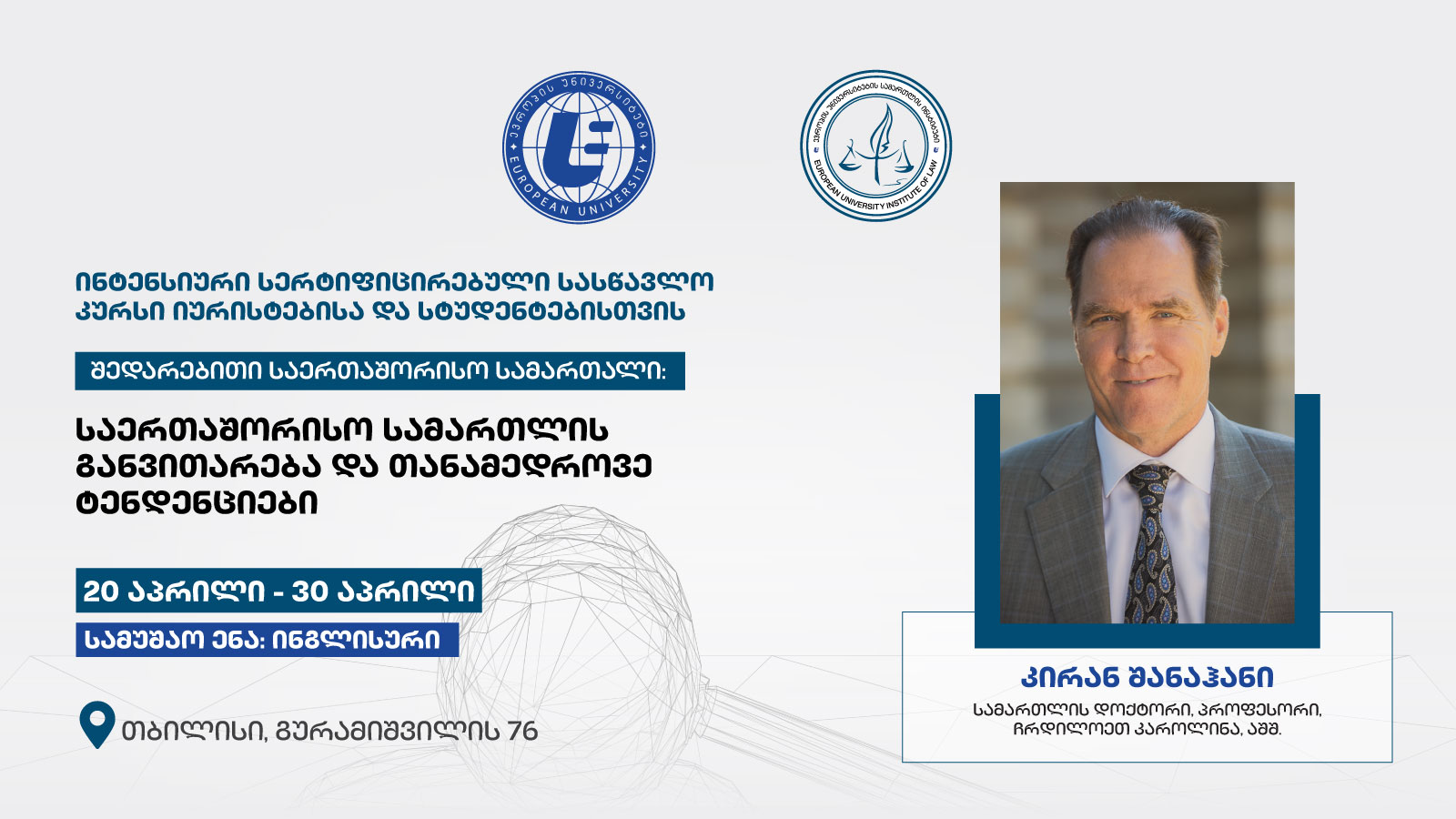 20-30 აპრილს, „ევროპის უნივერსიტეტის სამართლის ინსტიტუტის“ ორგანიზებით, შედარებითი საერთაშორისო სამართლის მიმართულებით ინტენსიური სერტიფიცირებული სასწავლო კურსი „საერთაშორისო სამართლის განვითარება და თანამედროვე ტენდენციები“ გაიმართება.