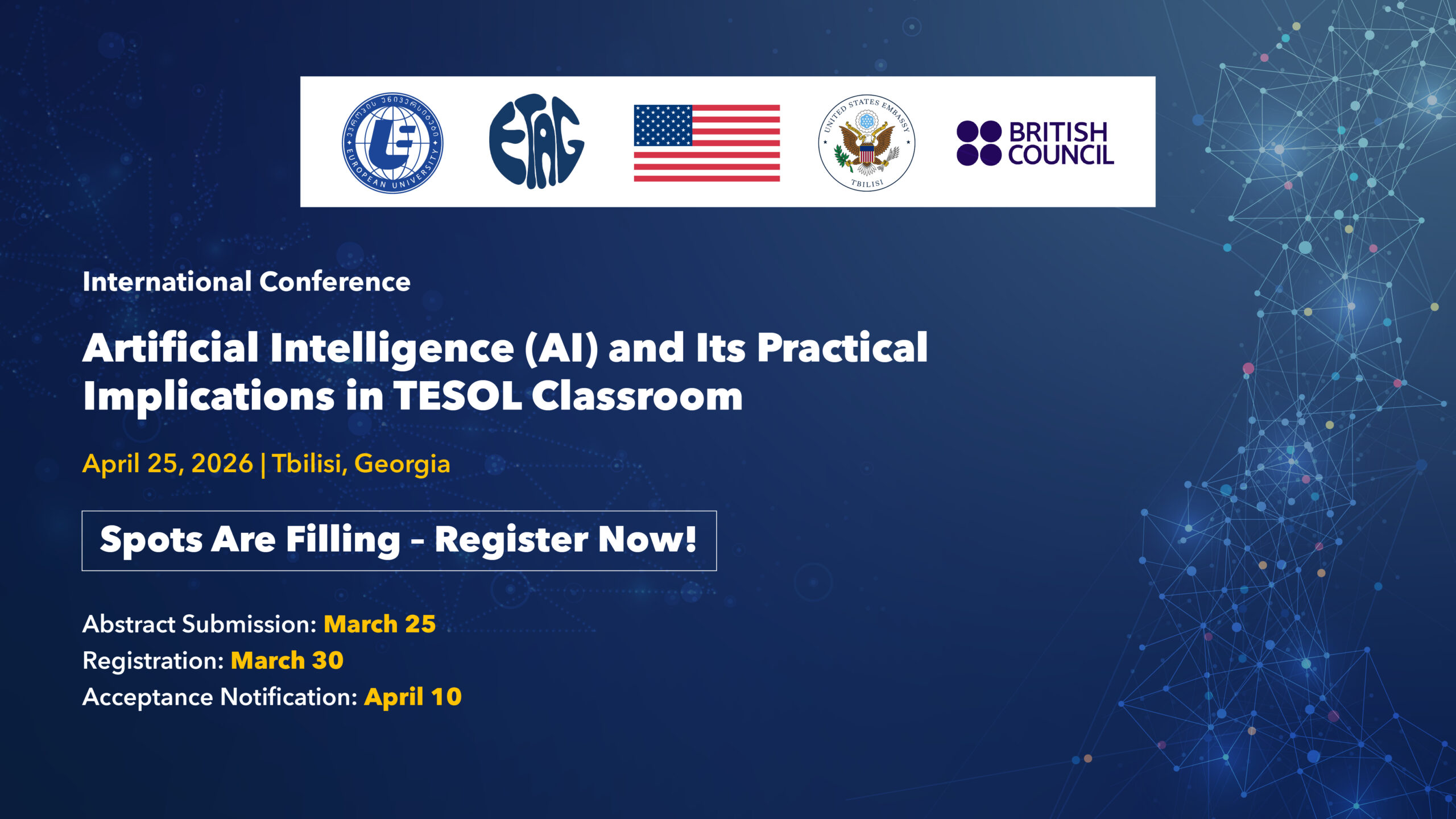კონფერენცია იწვევს მასწავლებლებს, მკვლევრებსა და განათლების სფეროს პროფესიონალებს მთელი საქართველოდან, რათა გააანალიზონ, AI-ზე დაფუძნებული ინსტრუმენტების როლი სწავლების მეთოდების გაუმჯობესებაში, სტუდენტების ჩართულობის გაზრდასა და შეფასებაში და სასწავლო გარემოს TESOL-ის კონტექსტში გადააზრებაში.