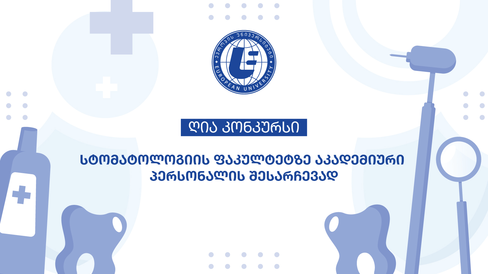 შპს ,,ევროპის უნივერსიტეტი’’ აცხადებს ღია კონკურსს სტომატოლოგიის ფაკულტეტის აკადემიური პერსონალის არჩევის მიზნით სტომატოლოგიის ინგლისურენოვანი საგანმანათლებლო პროგრამის ფარგლებში აკადემიური ნიშნით კლინიკურ დისციპლინაში შემდეგი მიმართულებით: