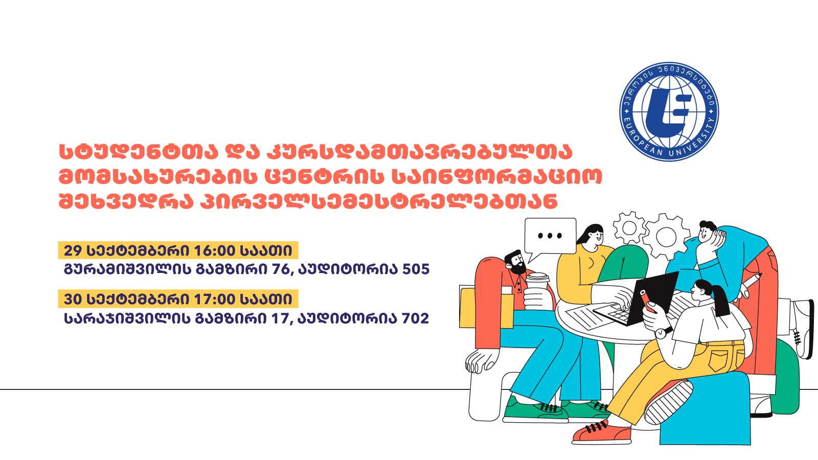 2025 წლის, 29-30 სექტემბერს, “ევროპის უნივერსიტეტის” სტუდენტთა და კურსდამთავრებულთა მომსახურების ცენტრის წარმომადგენლები პირველსემესტრელებთან საინფორმაციო შეხვედრებს ჩაატარებენ.