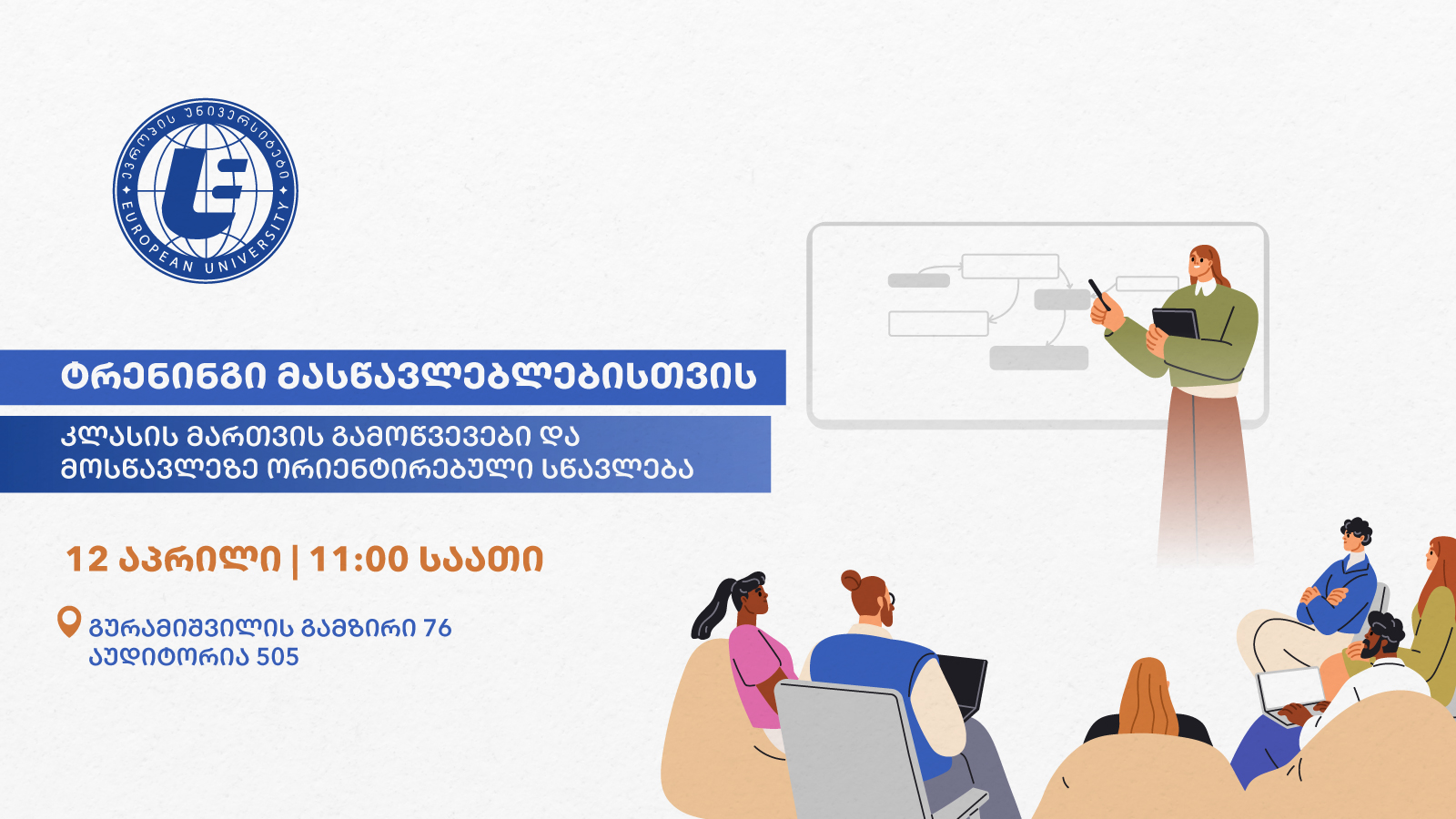 “ევროპის უნივერსიტეტისა“ და „ცენტრალური ევროპის უნივერსიტეტის“ ორგანიზებით და „სწავლების ინოვაციური მეთოდების ტრენინგცენტრის“ ინიციატივით, 12 აპრილს, 11:00 საათზე, “ევროპის უნივერსიტეტში” ტრენინგი თემაზე: “კლასის მართვის გამოწვევები და მოსწავლეზე ორიენტირებული სწავლება“ გაიმართება.